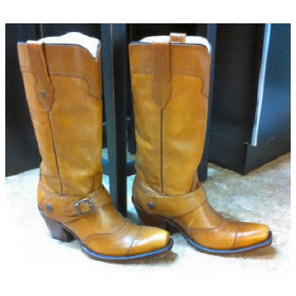 Genuine leather brown boot with mesquite harness strap across front. Square toe. Made in Mexico. (Discontinued style.)