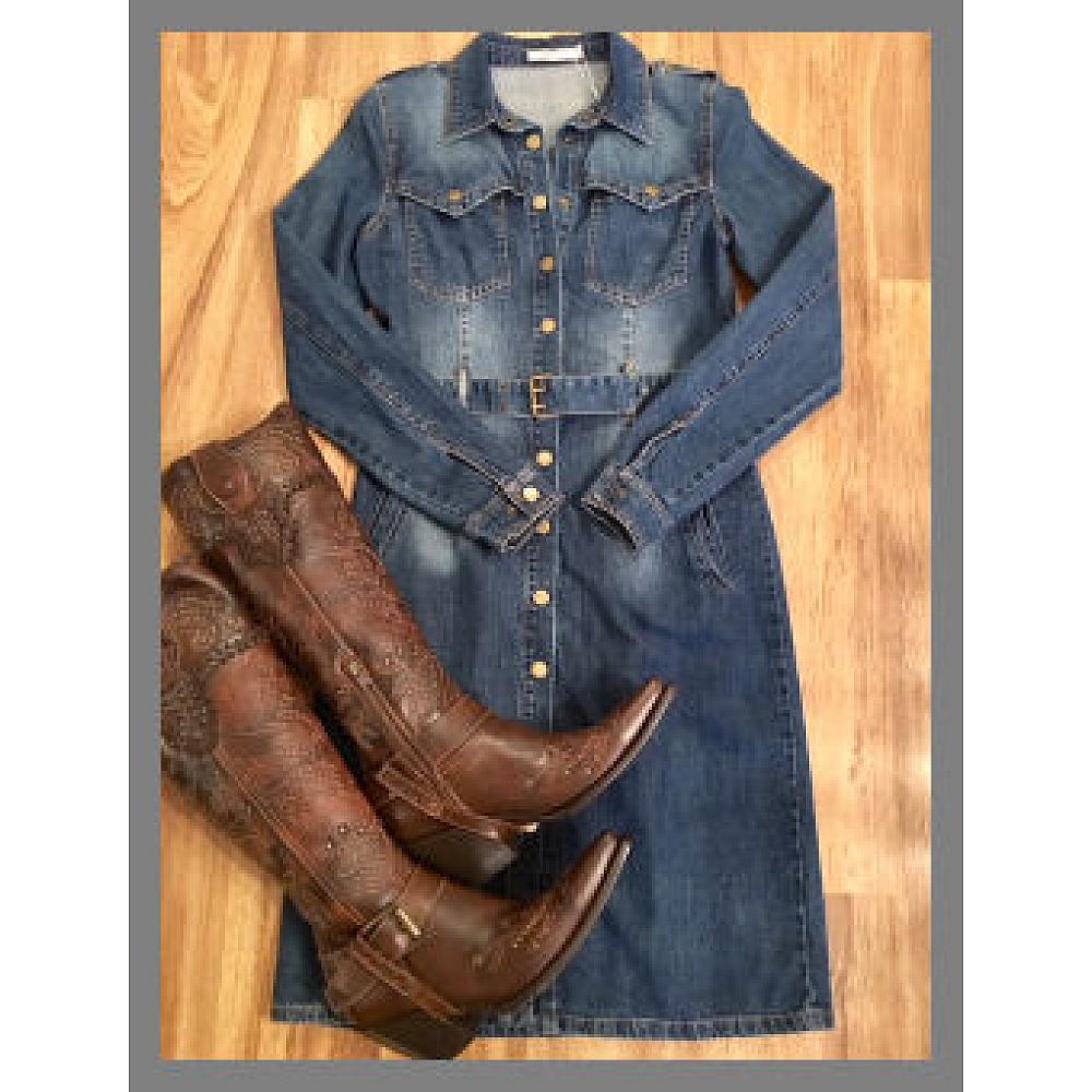 This snap front denim dress can also be worn as a duster over clothing in the winter. Belted with blue jean belt, pockets in the front. 100% Cotton. Hand wash cold, hang or line dry. Made in China.