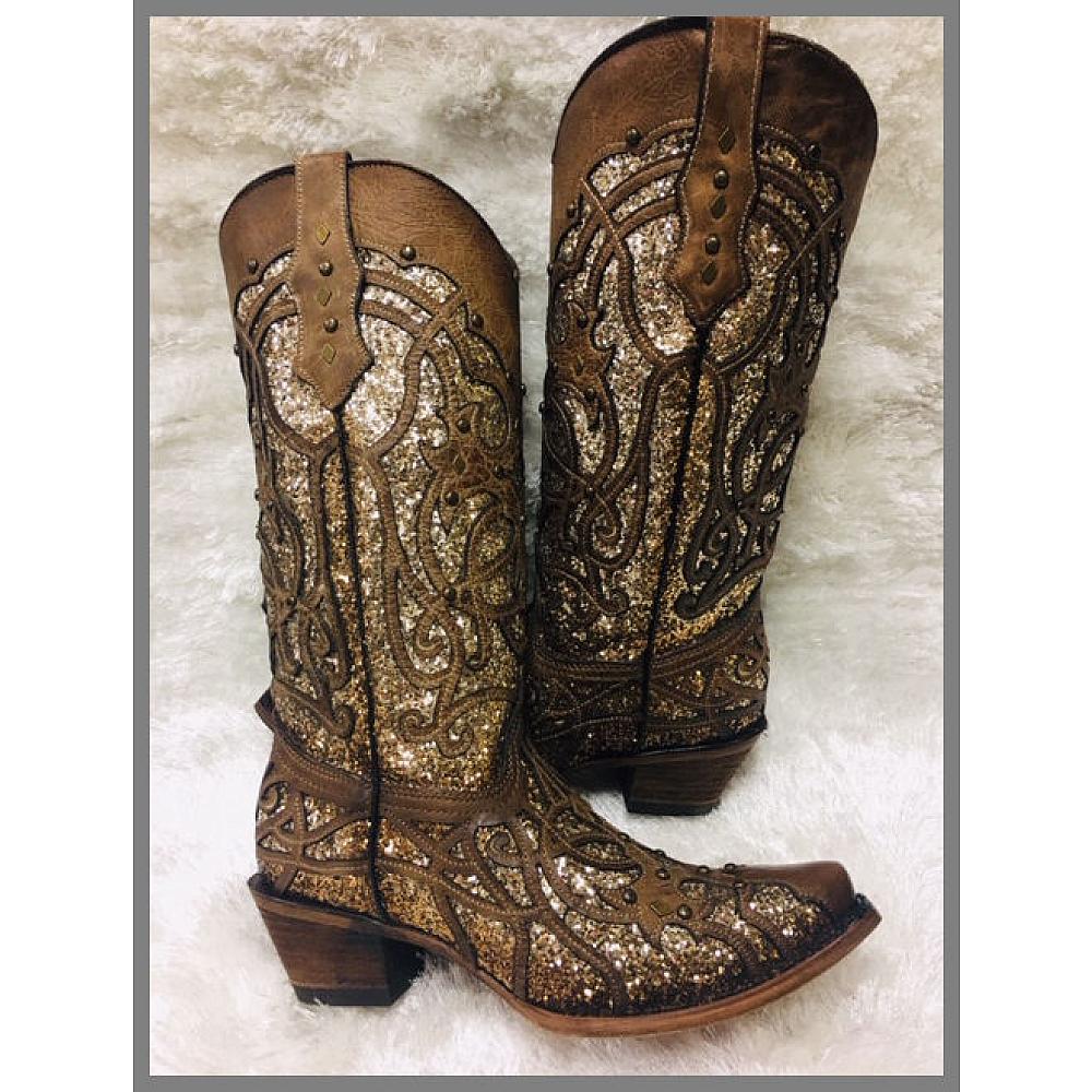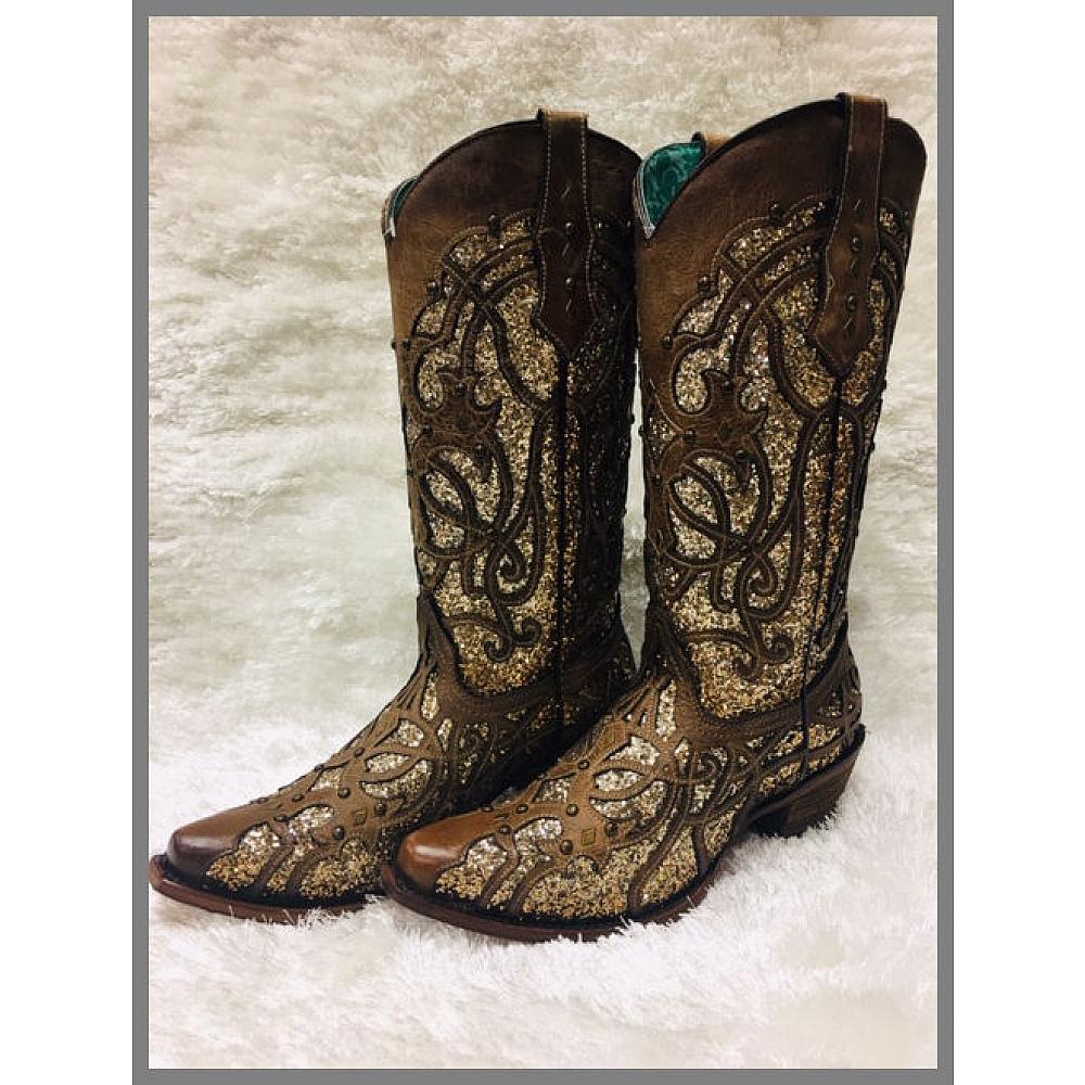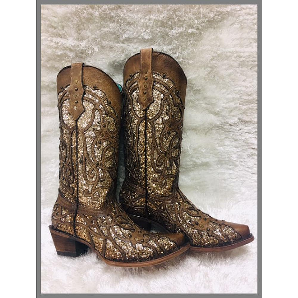 This Ladies Western Corral Boots Style C3331 Glitter Inlay & Studs boot is just gorgeous! Brown leather featuring gold glitter inlay and brad studs! No matter how you look at it, it's sparkly and classy! Handcrafted in Mexico. (#1525)