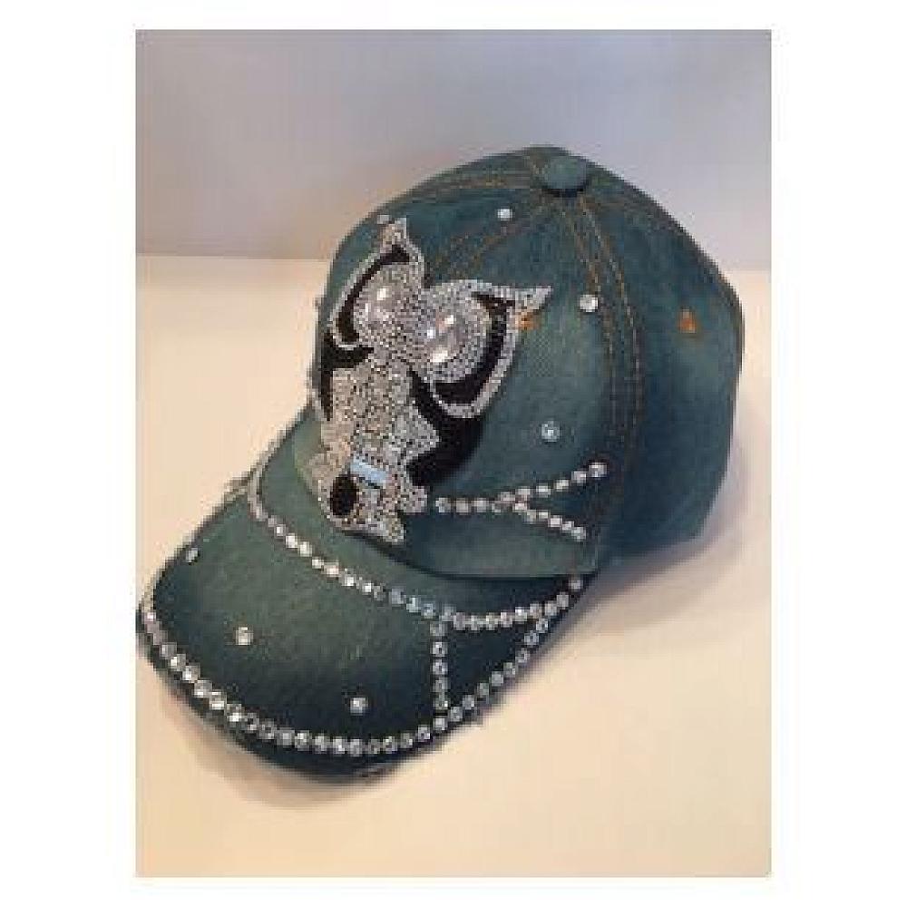 Ladies denim baseball cap featuring large owl on branch made of black rhinestones and clear crystals. Edges of hat are distressed and edge of bill outlined in rhinestones. Adjustable back strap for easy fit.