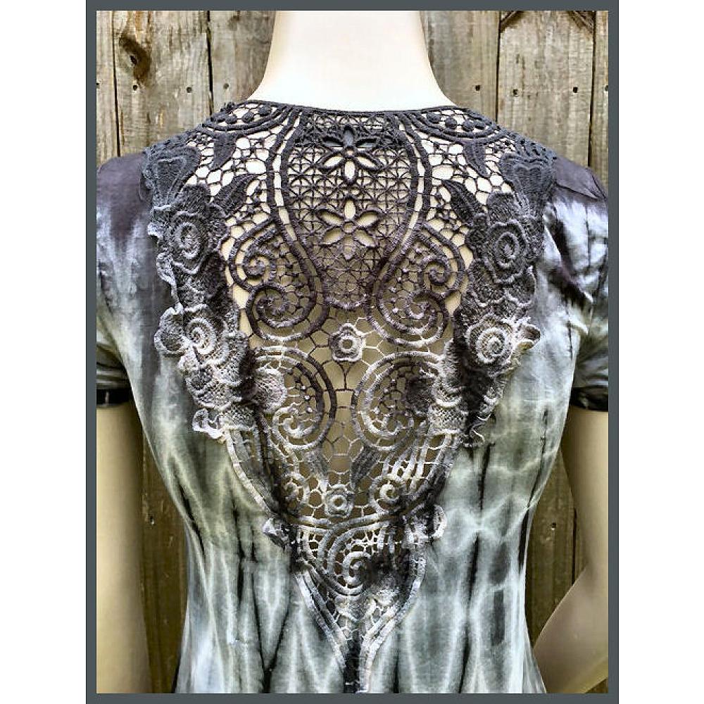 Casual but classy, this black and charcoal washed top features white burnout on front, a crochet lace neckline in the back, and lots of rhinestones to make you shine. Shark bite hem. Tailored to fit close.