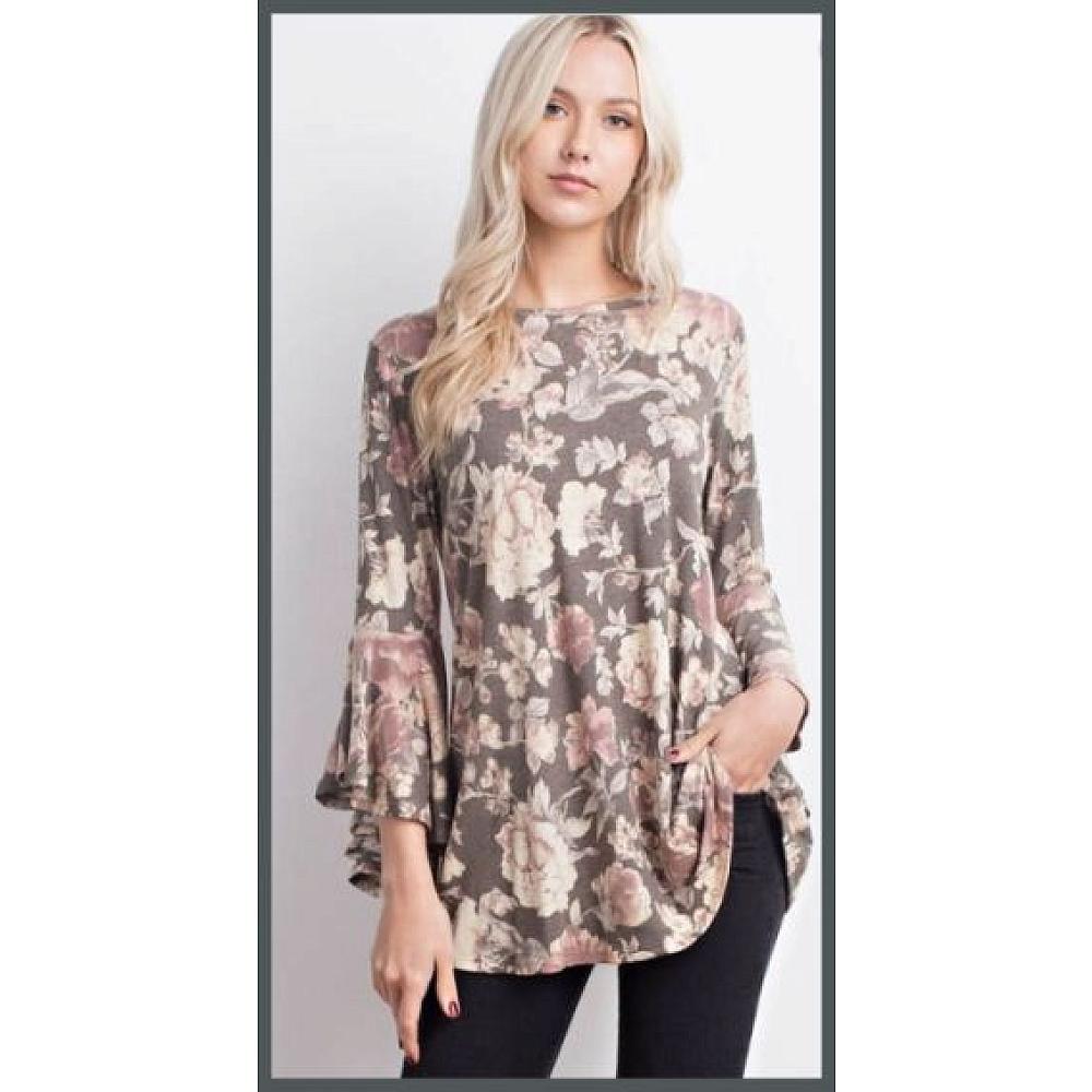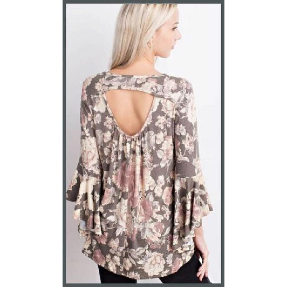 Olive, pink and white floral top with 3/4 length bell ruffle sleeve. Featuring cutout back neckline. (Colors may vary depending on viewing device.) Made in U.S.A.
