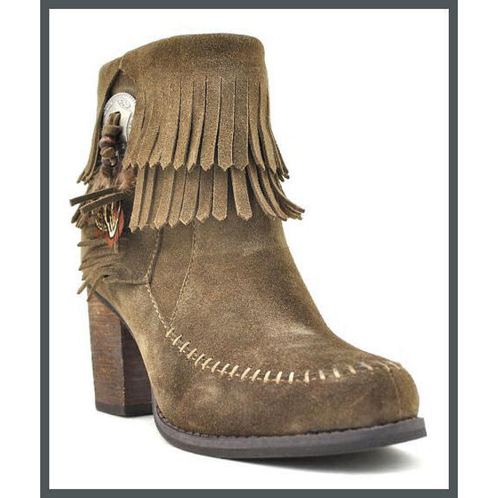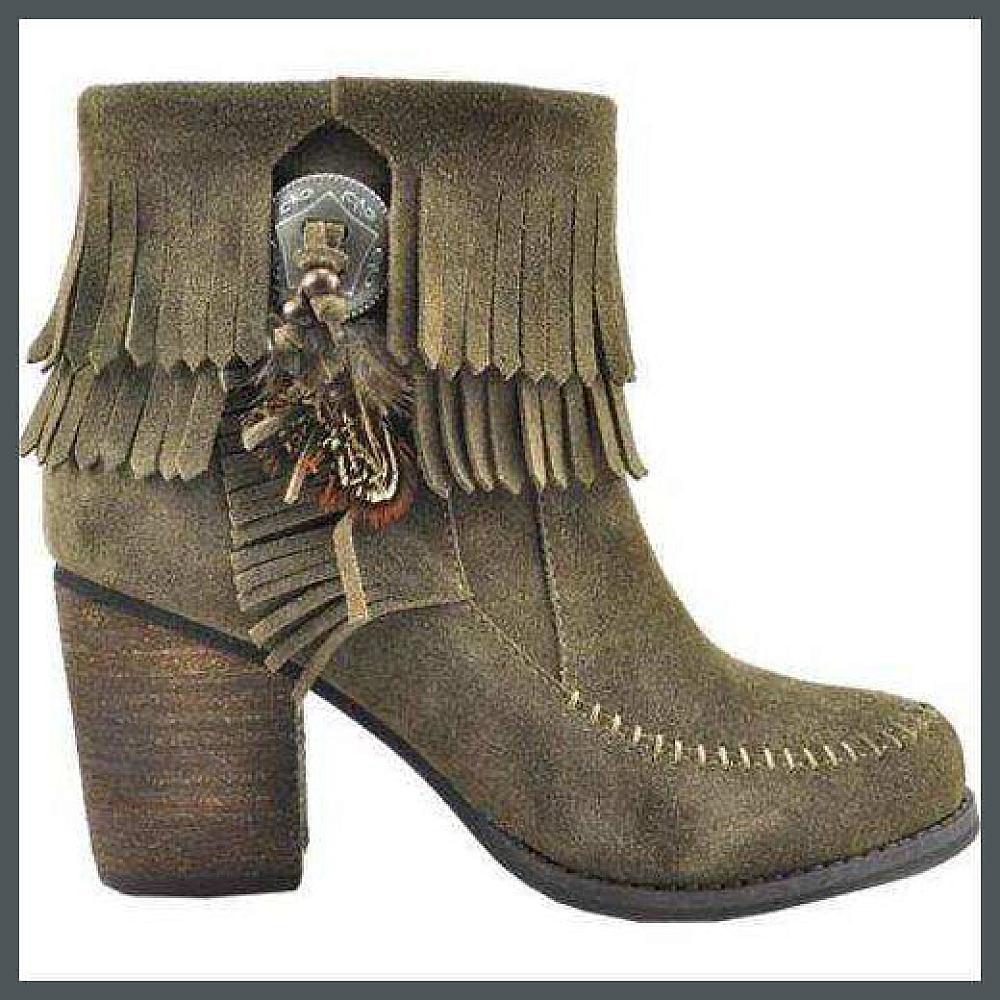 Great looking western ankle bootie with lots of class and style. Features two rows of fringe with a talisman disk, and feathers on one side, and a zipper on the other side for easy on/easy off. Dress up or dress down - the perfect bootie!