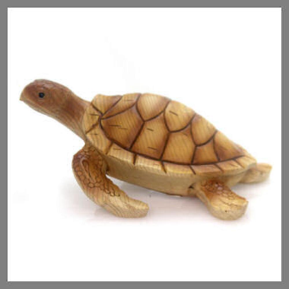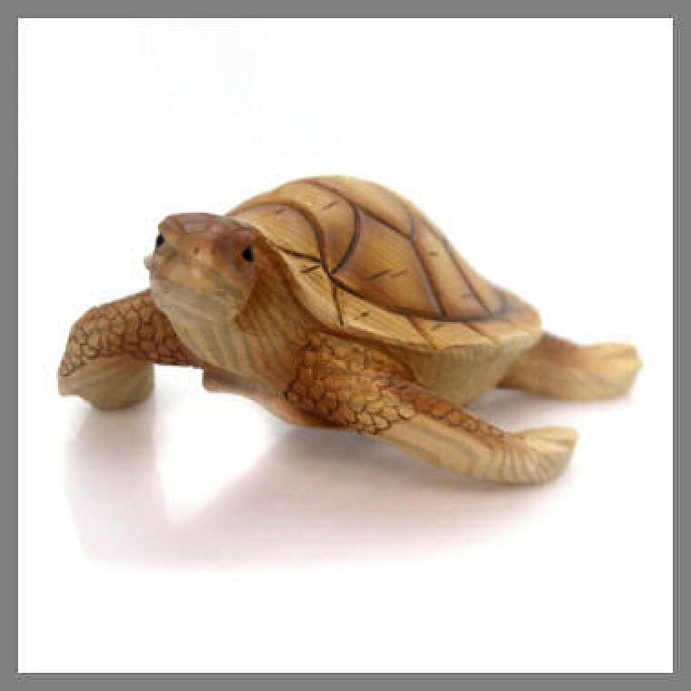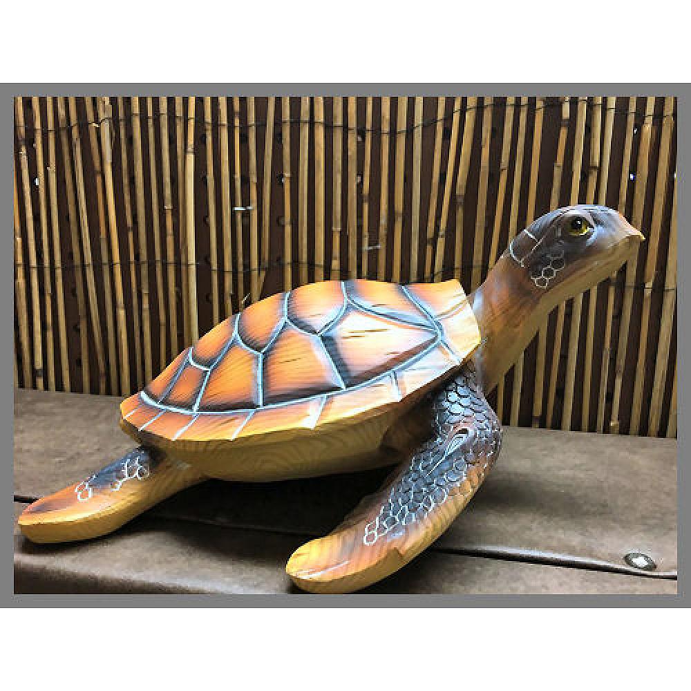 Polyresin, faux carved wood-look, featuring single large sea turtle. Measures 10-1/4" long x 8" wide x 5-1/2" tall.