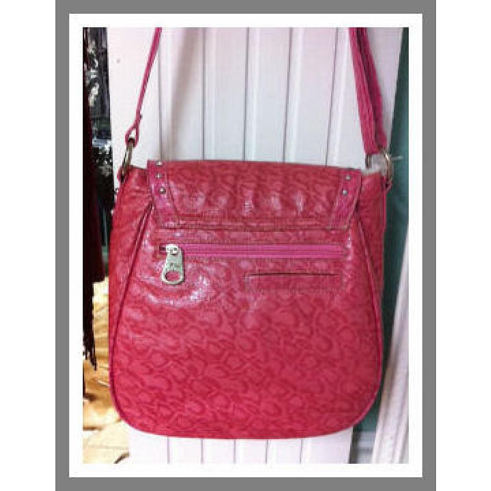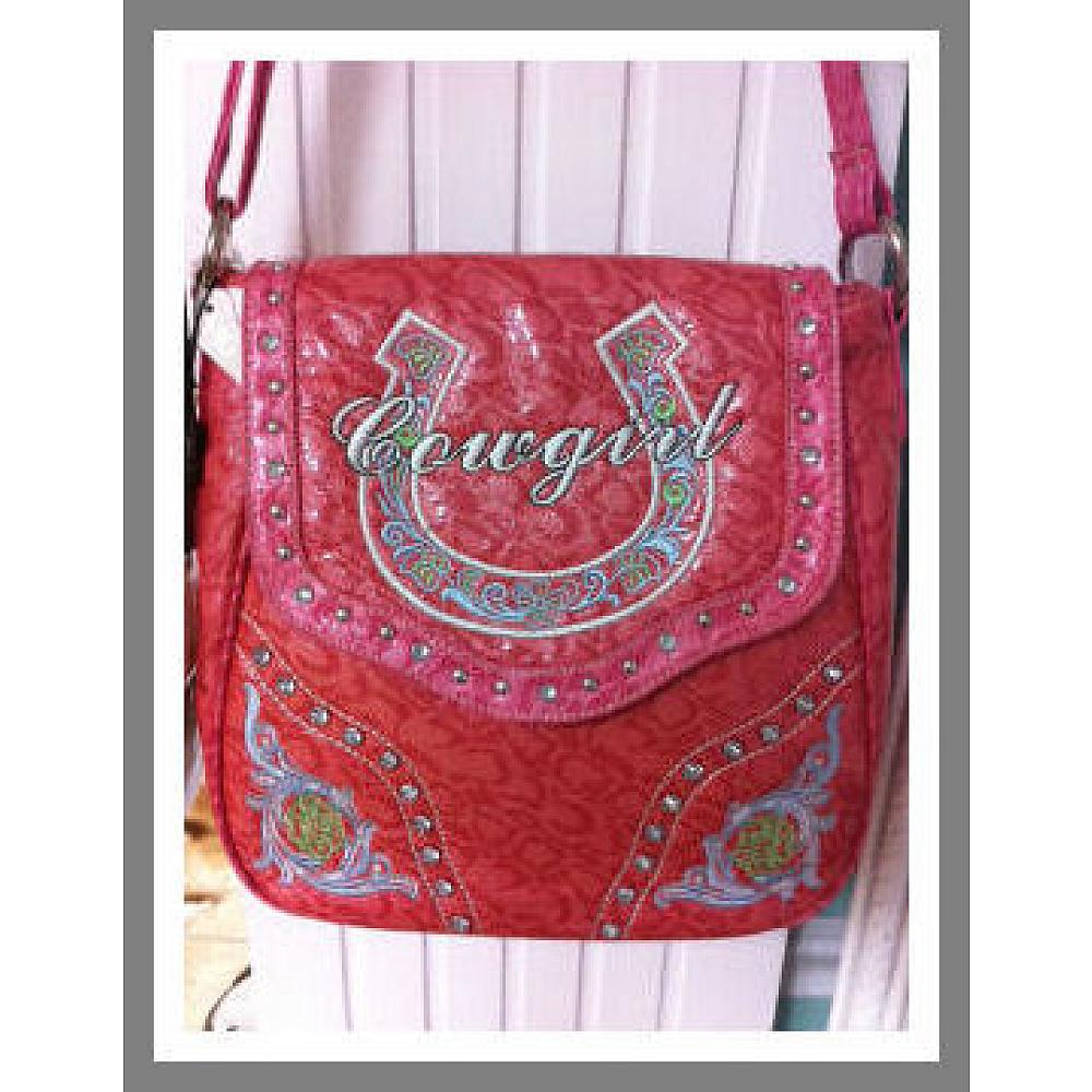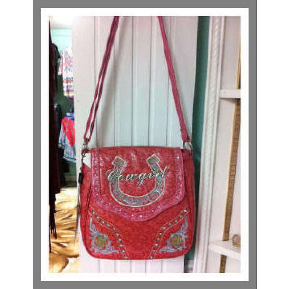 Embroidered cross-body messenger purse with "Cowgirl" over horseshoe and roses in each corner. Adjustable strap.